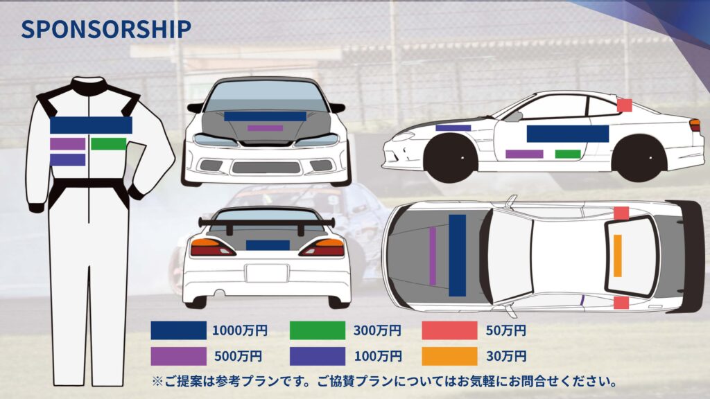 | レーシングスーツへの 御社ロゴ掲載 | 御社ロゴ掲載 | 御社ロゴ掲載 | 御社ロゴ掲載 | 御社ロゴ掲載 | — | — |
